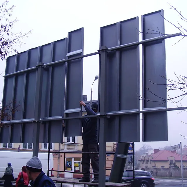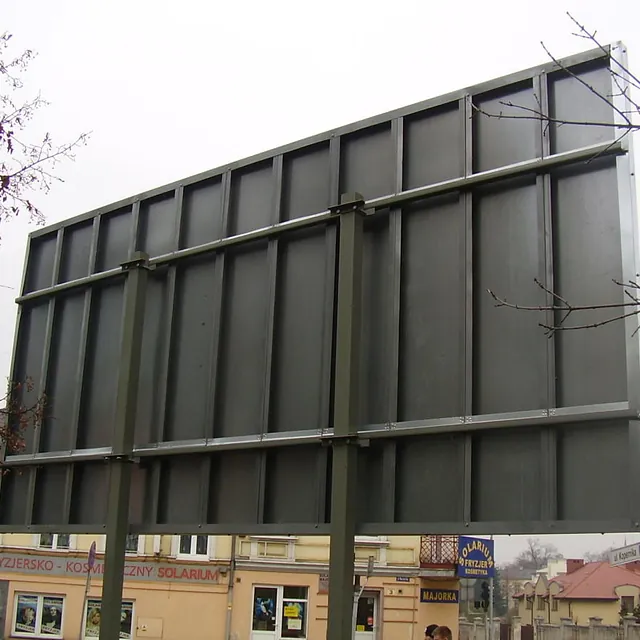 W przypadku realizacji o tak dużej powierzchni istotną rolę odgrywa solidna konstrukcja. Silny wiatr i opadu deszczu są szczególnie ryzykowne w przypadku konstrukcji reklamowych wolnostojących. Nasze billboardy mocowane są na metalowych słupach osadzanych bezpośrednio w ziemi, dzięki czemu cała konstrukcja zyskuje na stabilności. Sama powierzchnia reklamowa to z kolei wysokiej klasy blacha poddawana procesowi ocynkowania, co skutkuje dużo większą odpornością na korozję — największe zagrożenie w przypadku realizacji outdoorowych. Mocny stelaż oraz podział blachy na panele dodatkowo zwiększa żywotność konstrukcji.
